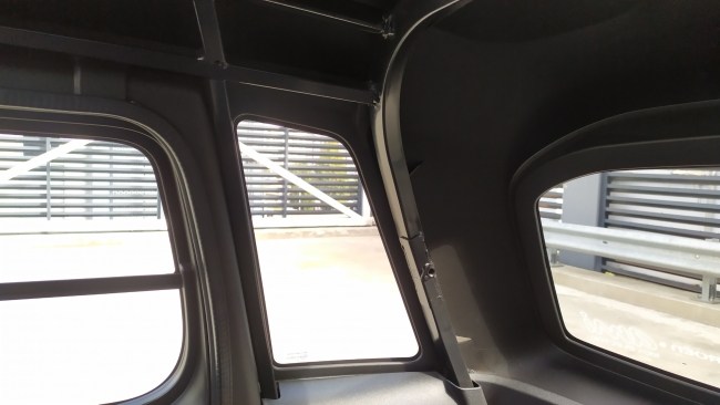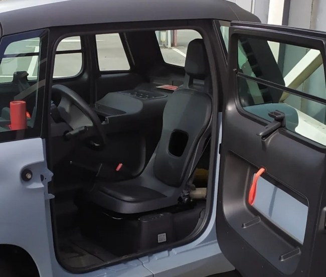 Двері авто дуже прості. Це фактично каркас, до якого з зовнішнього боку прикріплена тонка кузовна панель. Взимку від неї буде добряче тягти холодом - факт. Цікаво що на самих дверях не передбачено жодних механічних пристроїв. Навіть замок винесли на кузов. Так що для розблокування дверей треба потягти яскраву помаранчеву стрічку, що висить ліворуч від керма.