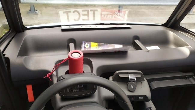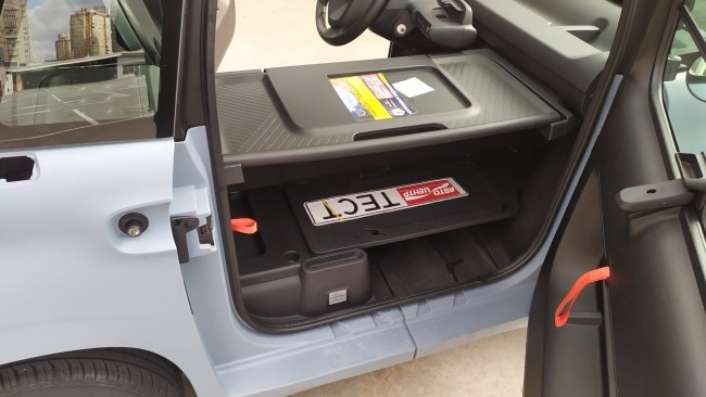 Відділення, розташоване на місці де мало б бути крісло пасажиру, може вмістити до 260 літрів вантажу. Це можна порівняти з багажником невеликого хетчбеку. Якщо від вантажопідйомністі машини в 140 кг відняти вагу водія, то залишається 60-65 кг на завантаження різним скарбом. Багажне відділення організовано гарно. Є дві полички, що знімаються. На верхню можна навантажити аж до 40 кг. А ще в ній є спеціальна кишеня під планшет. Я там розташував тестові номерні знаки, адже до Ami вони не підійшли. В малечі квадратні номерні таблички. А що ви хотіли - квадроцикл!