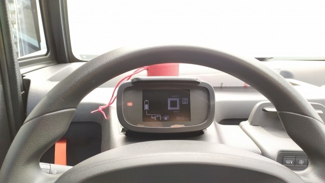 Панель приладів в Амі електронна. На неї виведені дані з швидкості руху, одометр, запас ходу, залишковий заряд батареї та обраного режиму руху (передачі). Не сподобалась яскравість. В яскравий день роздивитись показчики складно. А зробити яскравіше не можна.