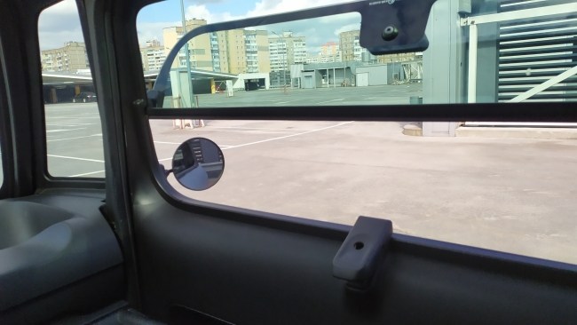 Сидиш практично з усіх боків оточений склом. Дзеркала заднього огляду правда ну вже дуже малесенькі. Але навіть з ними паркуватись легко. До речі поставити машину можна навіть в мінімальний розрив між авто на парковці. Просто ставиш Амі не вздовж, а впоперек. Зважаючи на ширину 1,4 метри знайти місце дуже просто. Та й довжина машини в 2,4 метри не сильно більша за ширину звичайного авто, якщо рахувати разом з дзеркалами. А от виходити з машини на щільній парковці треба акуратно. Двері Амі досить великі. То ж коли виходиш треба їх притримувати, аби не гепнути дверима об авто поруч.